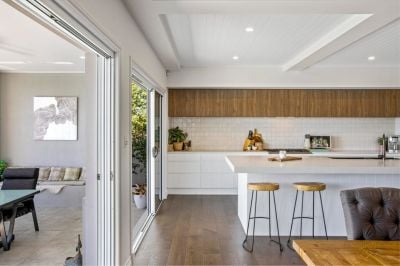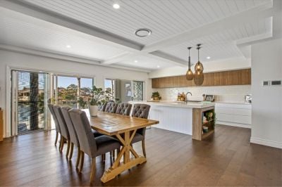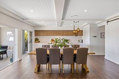 The grand entry, with its soaring double-height ceiling, sets the tone for the spacious interiors that follow. Featuring five generous bedrooms plus a study/sixth bedroom and three bathrooms, the residence is both versatile and refined. A stunning entertainers’ kitchen, complete with butler’s pantry, Caesarstone finishes, and premium European appliances, anchors the home, while the expansive living areas spill effortlessly outdoors.