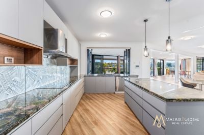 The luxurious master retreat boasts a large panoramic waterfront window, a walk-in wardrobe, a generous well-appointed ensuite and dual access. The ground level also has the study/6th bedroom, media room, laundry, guest bathroom, outdoor entertaining deck, double garage and private jetty. Ascending the grand staircase or using the 4-person lift to the second level, another expansive living area awaits. The second storey also features four more bedrooms and another bathroom.