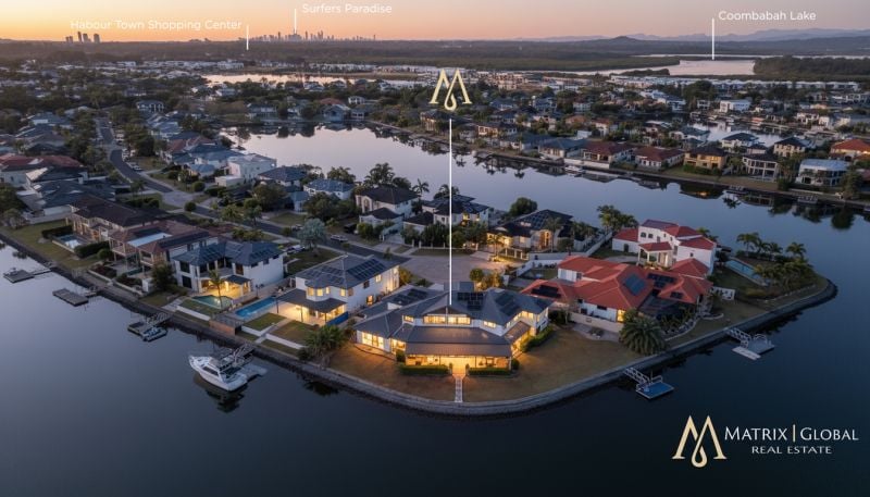 Offering the pinnacle of Gold Coast living, the property is perfectly positioned in a serene Cul-de-Sac with a coveted north-facing aspect and breathtaking, uninterrupted 180-degree water views across an astonishing 68 meters of waterfrontage. This truly stunning residence showcases unparalleled elegance and an impressive blend of sophistication and comfort, promising the lifestyle you’ve always dreamed of.