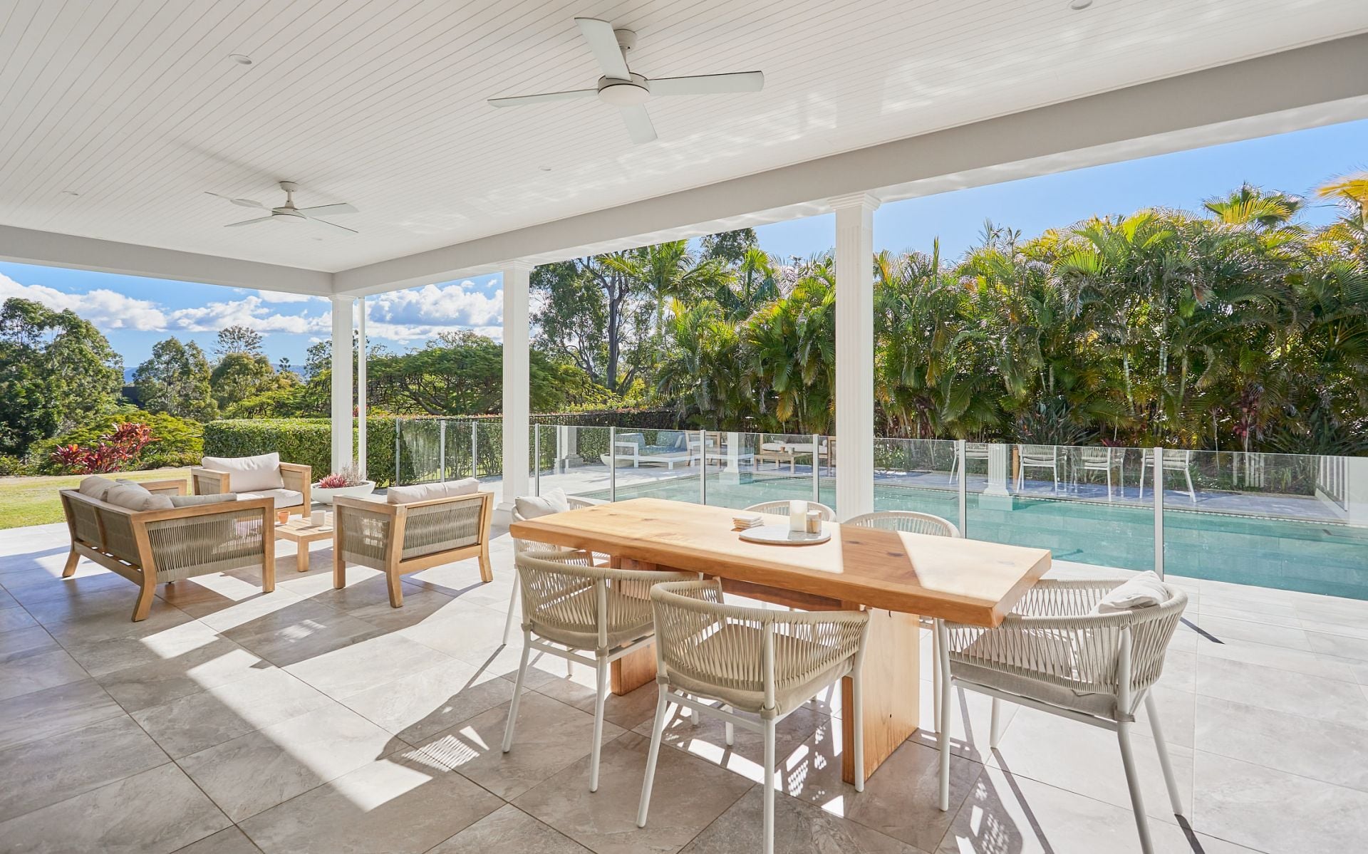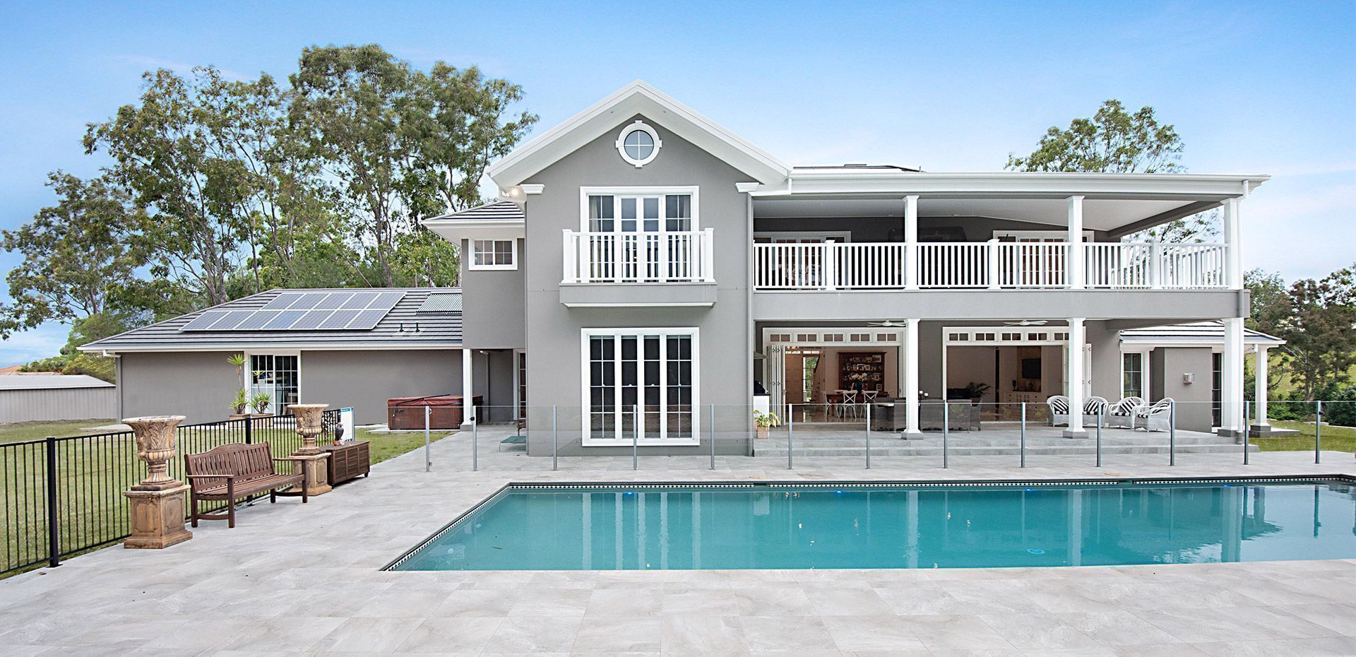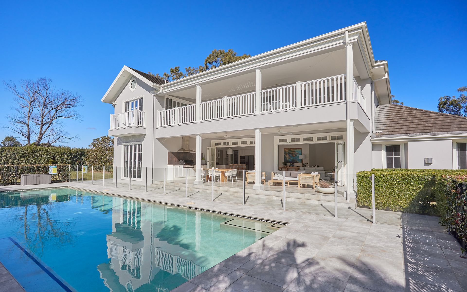 A family sized swimming pool is framed by paved sun lounge surrounds, a relaxed pergola setting and a perfectly level lawn. There is a ground level poolhouse or possible guest bedroom with walk-in wardrobe and ensuite, opening directly to the outdoors.